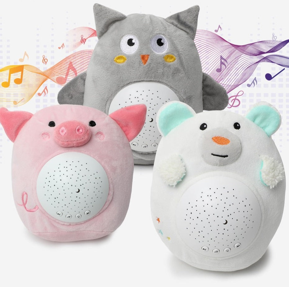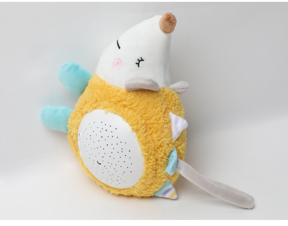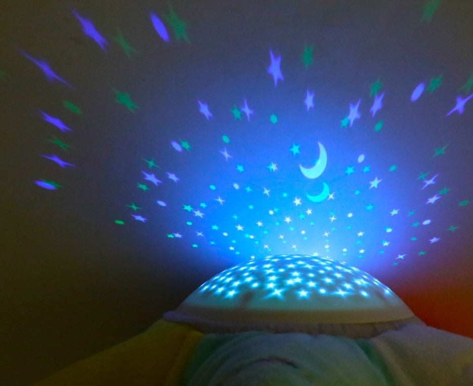 Animais de pelúcia com projeção de céu estrelado e música para trazer conforto ao bebê na hora de dormir, deixando mais calmo e sem medo de ficar no escuro.