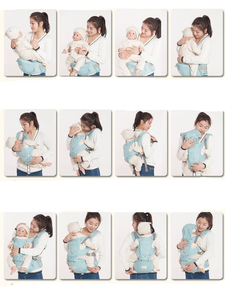 2. Mãos livres. 3. Ergonômico. 4. Material Premium com capuz. 5. Compartimentos úteis. 6. Carregue bebês de 0 a 3 anos. 7. Mais de 10 posições para transporte.