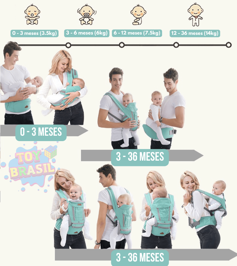 Com mais de 10 posições diferentes para transporte, se adapta perfeitamente ao crescimento do seu bebê, podendo ser usado até os 4 anos deidade, suportando até 30kg 💪