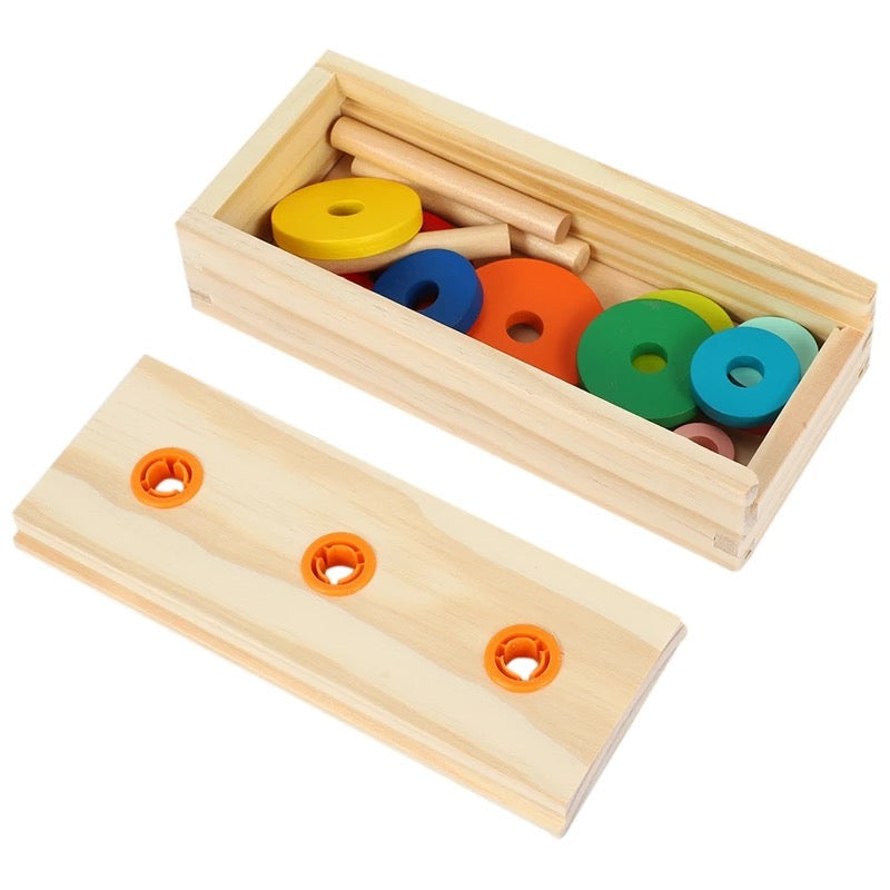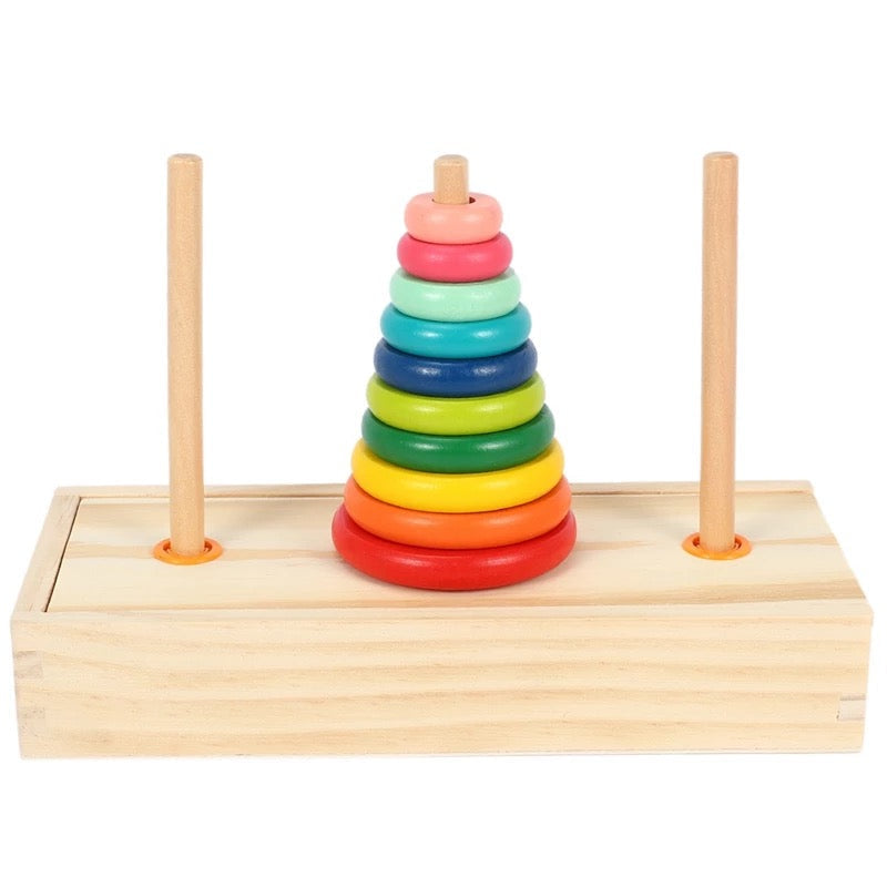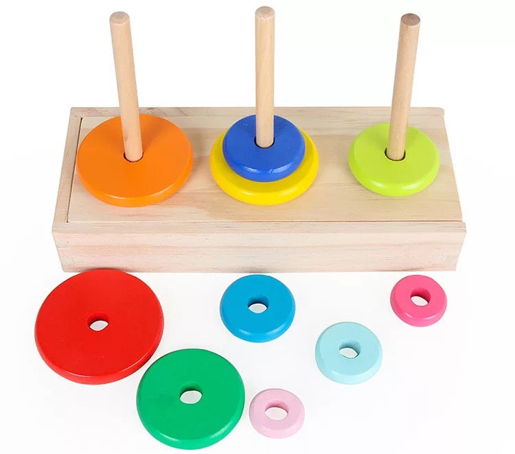 👉 Indicado para crianças a partir de 3 anos para a uma brincadeira simples de encaixe e a partir de 6 anos para a aplicação dos desafios de estratégia propostos pela Torre de Hanói.